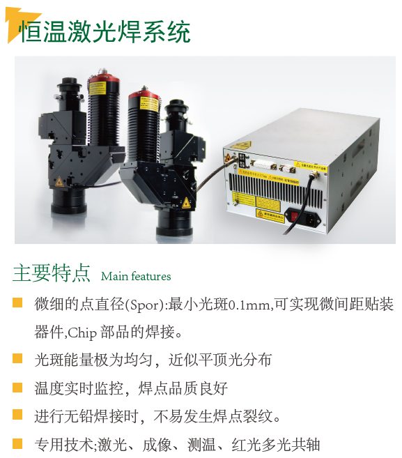 YABO鸭脖官网光电激光恒温锡焊实时温度反馈系统,CCD同轴定位系统以及半导体激光器所构成;独创PID在线温度调节反馈系统,能有效的控制恒温焊锡,有对焊锡对象的温度进行实时高精度控制等特点,确保焊锡良品率与精密度。尤其适用于对于温度敏感的高精度焊锡加工,如PCB线路板器件/微型扬声器/马达、连接器、摄像头等等。