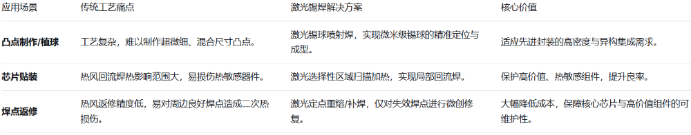 为了方便理解,下表概括了激光锡焊在BGA封装中的主要应用场景及其独特价值: