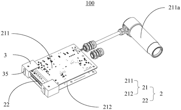 电路板组件:包括多个沿上下向间隔排布的板体和对应板体间隔设置的至少一个双排针,板体和双排针位于容置腔内,各双排针用以电连接相邻的各板体。该组件还设有红外测温模块和反馈驱动模块,红外测温模块的部分设于一板体处,反馈驱动模块的部分设于与之相邻的另一板体处。